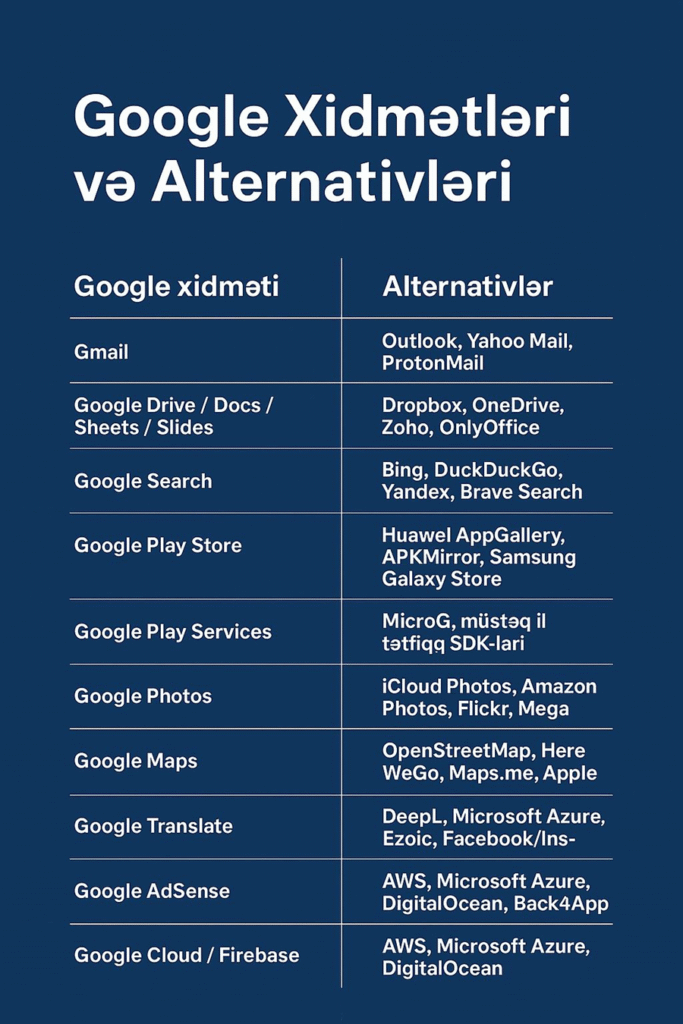 Bütün bunlara baxmayaraq, Google xidmətlərinin alternativləri mövcuddur. Başqa e-poçt xidmətləri, bulud saxlama platformaları, xəritə və tərcümə tətbiqləri istifadə oluna bilər. Amma açıq-aydın görünür ki, Google-un birdən-birə bağlanması ölkənin həyatına çox böyük zərbə vura bilər.